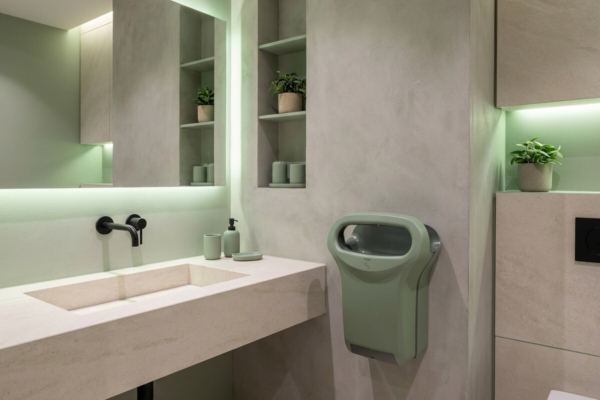 Für Architekten und Innenarchitekten ist diese Kollektion zugleich ein echtes Ausschreibungs- und Planungstool. Mit drei aktuellen Tönen (Terra Cota, Mineralblau, Salbeigrün) lässt sich der Händetrockner bereits in der frühen Planungsphase – Pläne und Leistungsverzeichnis – in die Material- und Farbpalette integrieren, genau wie Armaturen, Wand-/Bodenbeläge oder Accessoires. Das Ergebnis: Ein technisches Produkt, das die architektonische Intention am Ende der Bauphase nicht mehr „stört“, sondern sich selbstverständlich in die Identität des Ortes einfügt – mit kontrollierter ästhetischer Kohärenz und ohne Kompromisse bei den Betriebsanforderungen in professionellen Sanitärbereichen.