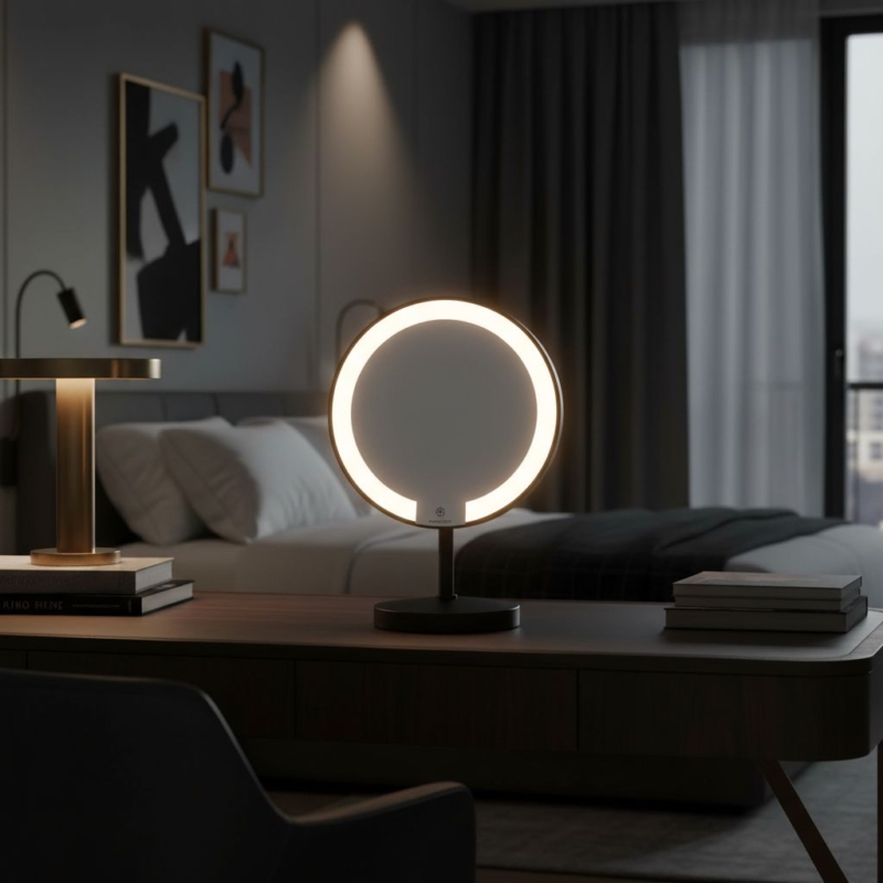 Der mattschwarze Cosmos-Spiegel mit Sockel (200 mm Durchmesser), aus Messing mit matter schwarzer Oberfläche, verfügt über einen stabilen Sockel und weiße LED-Beleuchtung. Mit 5-facher Vergrößerung und 3 Jahren Akkulaufzeit schaltet er sich nach 3 Minuten Inaktivität automatisch aus. Die kompakten Abmessungen (295 mm Höhe, 150 mm Breite) machen ihn ideal für Hotelzimmer. Konzipiert und designed in Frankreich, vereint er Eleganz und Funktionalität.