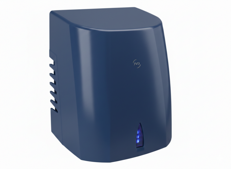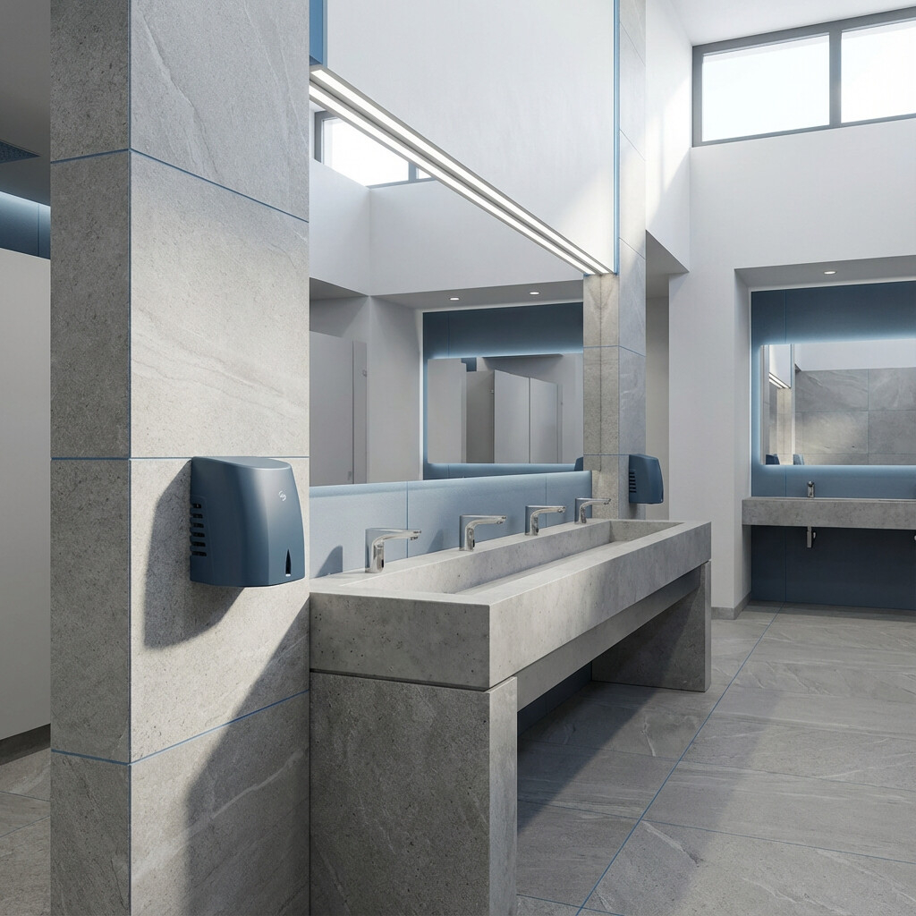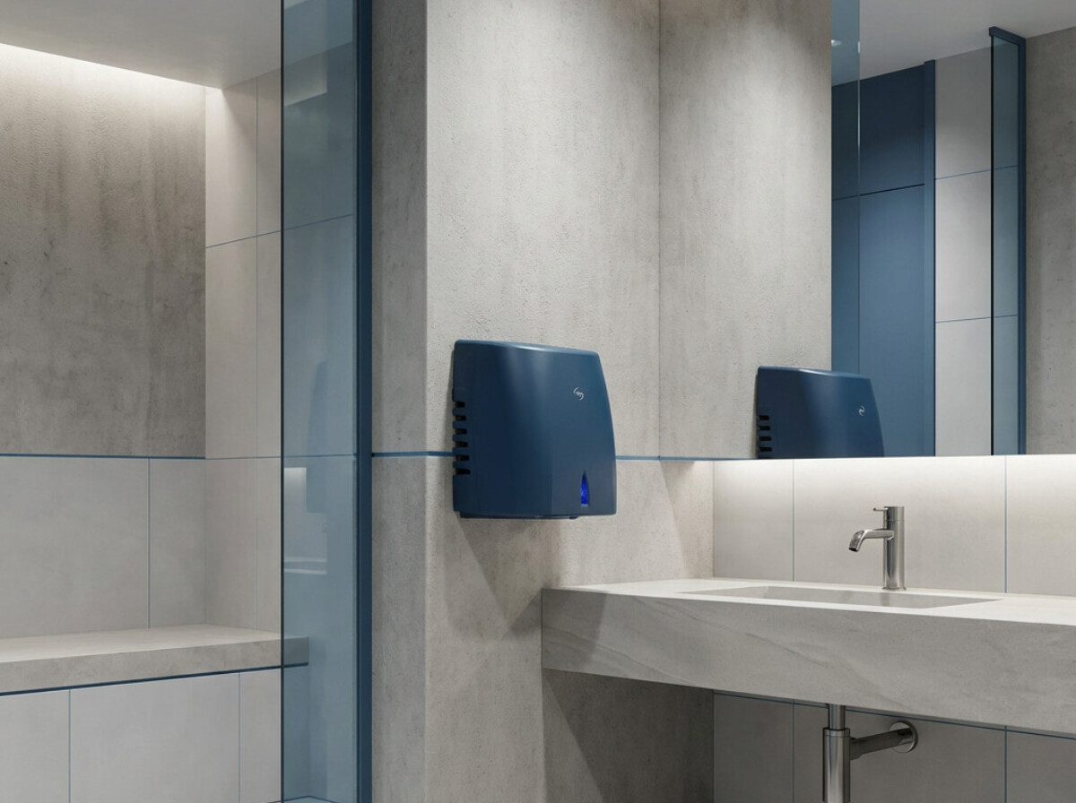 Copt'Air Händetrockner in Mineralblau mit geringem Stromverbrauch und vandalismussicherem Design (Aluminiumgehäuse). Ultrakurze Trocknungszeit dank drehbarer Düse. Geeignet für stark frequentierte Bereiche.