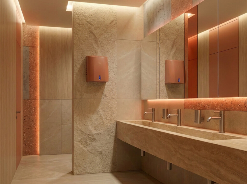 Copt'Air Händetrockner in Terrakotta mit geringem Stromverbrauch und vandalismussicherem Design (Aluminiumgehäuse). Ultrakurze Trocknungszeit dank drehbarer Düse. Geeignet für stark frequentierte Bereiche.