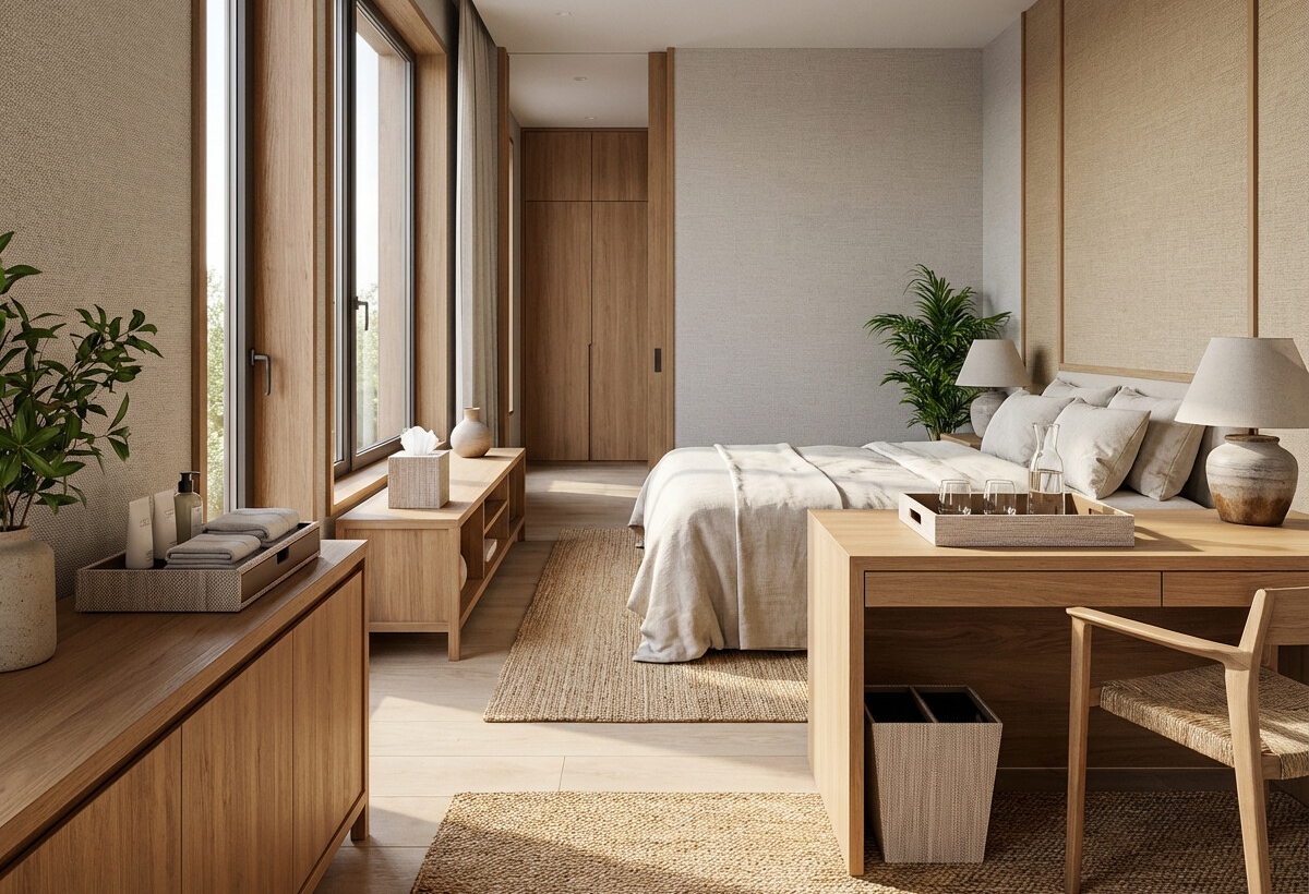 Elegance and functionality for hotel room accessories in the Tribe collection, with an olive synthetic leather interior and a grey-beige woven exterior finish.