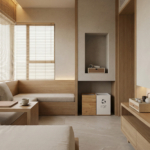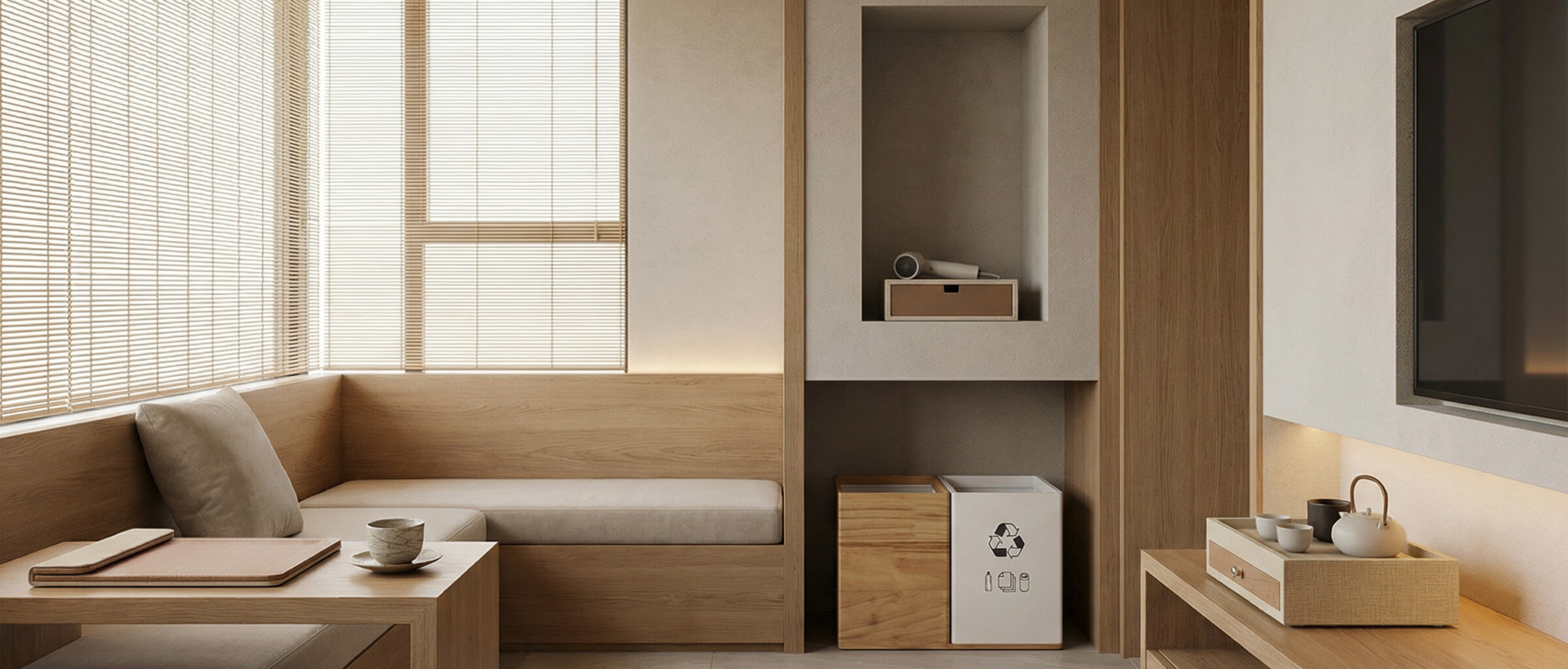 With its bi-material finish, the Kaizen accessory collection combines beige canvas and light wood for a modern and refined style. Ideal for adding a sophisticated touch.
