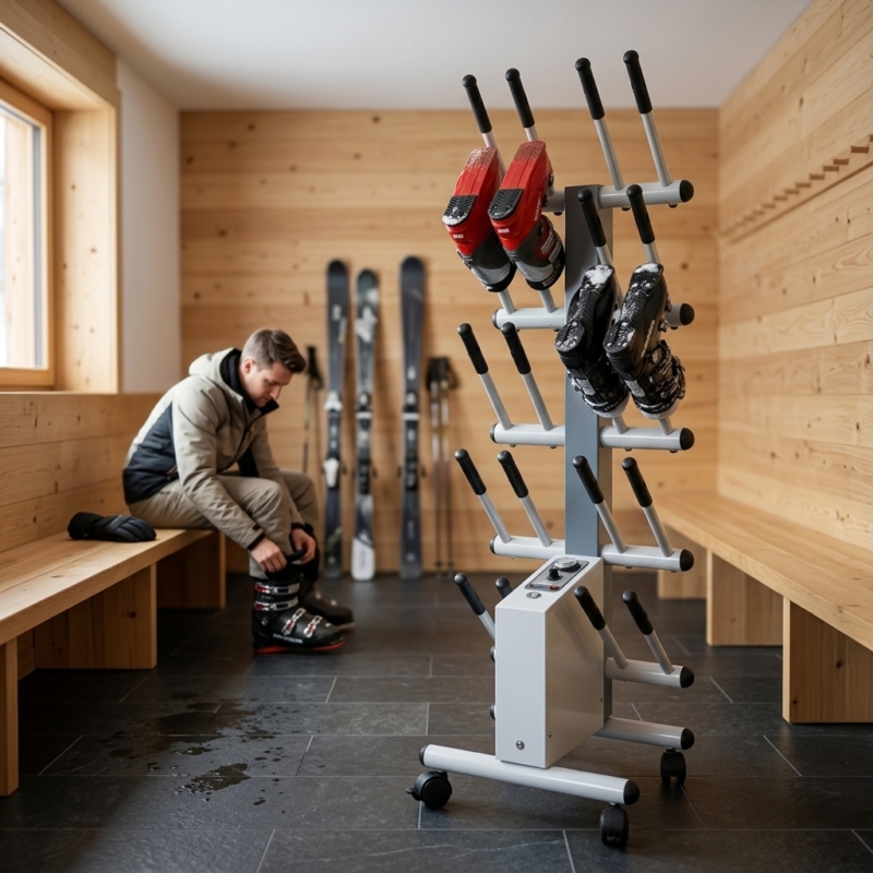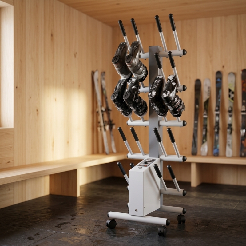 The HYGIdry is a professional ski boot dryer made in France, designed for quick drying and deep sanitization of up to 10 pairs of boots. Thanks to its powerful ventilation system and heating resistance, it dries boots in less than an hour. The stainless steel manifold and the anti-waste valve ensure optimal efficiency. Additionally, the ozone sanitization system eliminates bacteria responsible for bad odors.