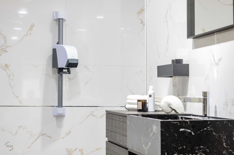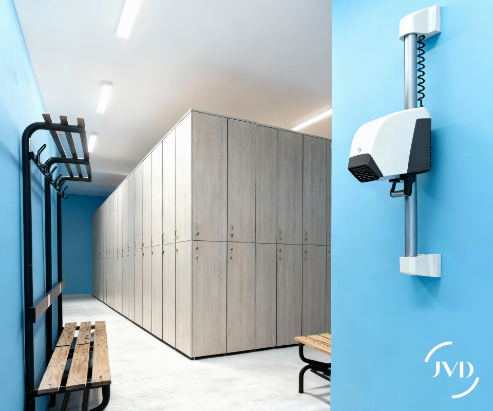 Neptune white hair dryer for pools and gyms, resistant in chlorinated atmosphere and provided with an induction motor for intensive use. Adjustable and ergonomic height (180° rotation). 3 years warranty.