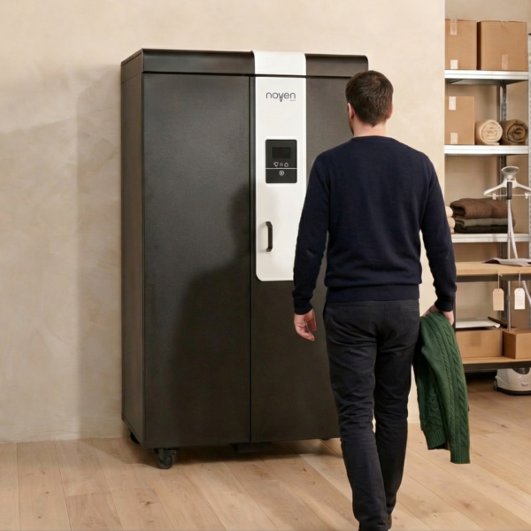 El armario Novven trata las piezas textiles sin agua, sin productos químicos y sin estrés mecánico. Secado homogéneo, desinfección bacteriana y desodorización profunda: cada artículo sale higienizado y listo para la venta, sin que su integridad se haya visto comprometida.