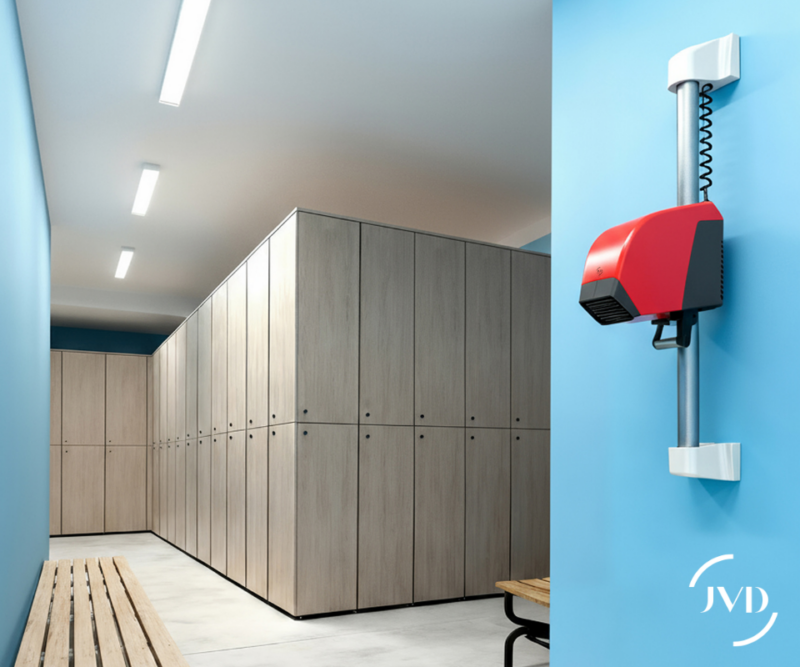 Secador de pelo Neptune rojo para piscinas y gimnasios, resistente en atmósfera clorada y provisto de un motor de inducción para uso intensivo. Altura ajustable y ergonómico (rotación 180°). Garantía 3 años.