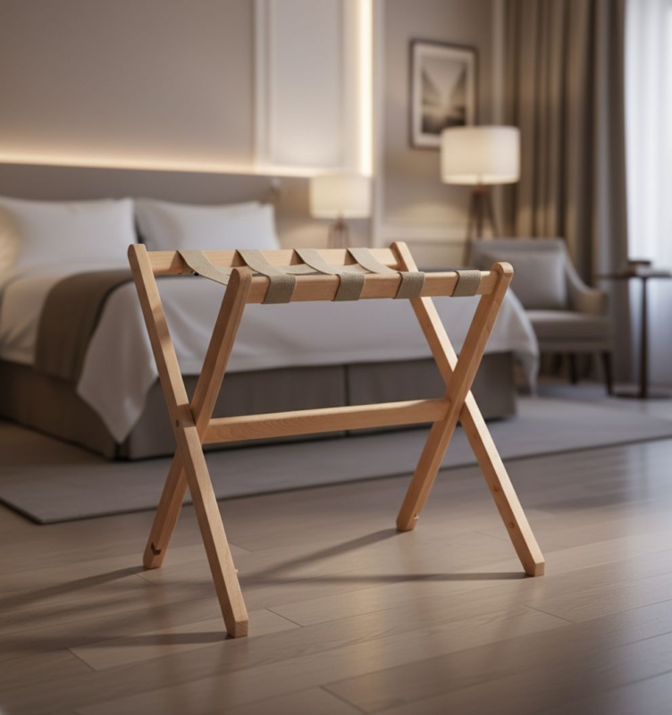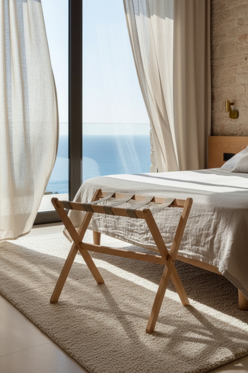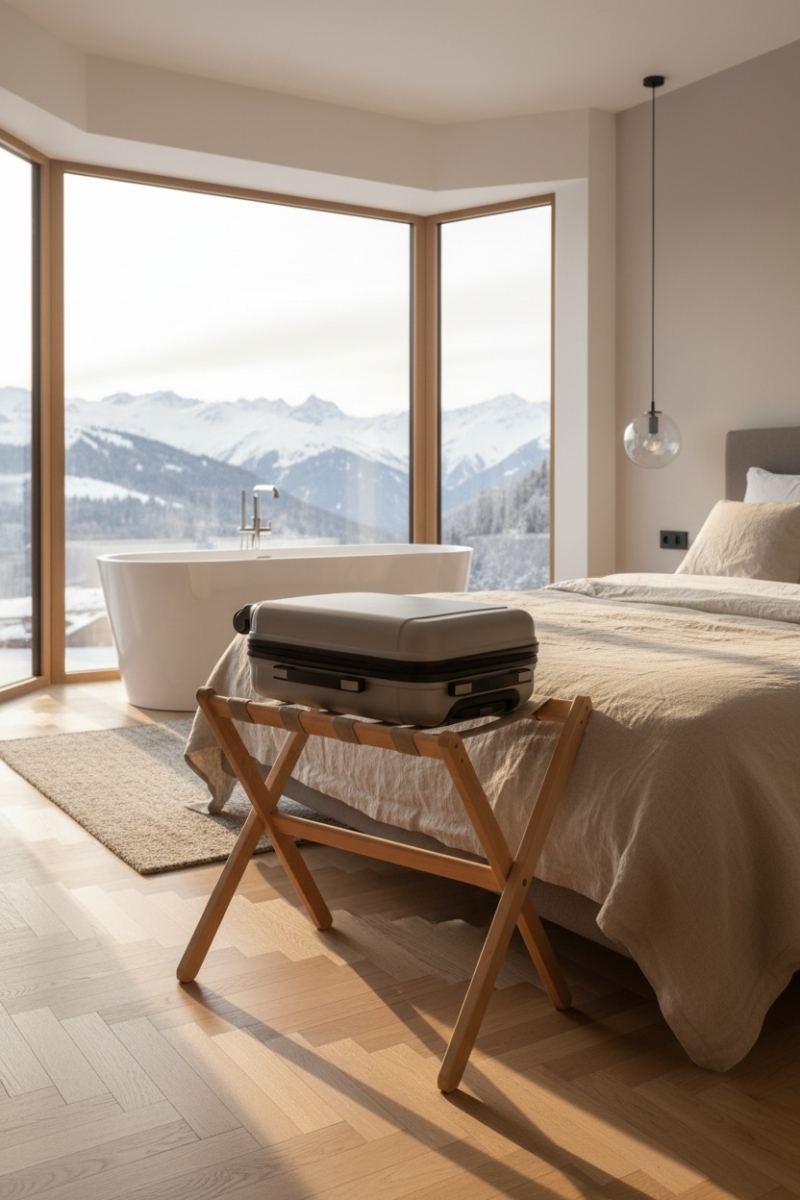El soporte para maletas Berengere es una combinación del saber hacer francés. Desde el uso de materiales nobles de origen local hasta la contratación de personas en situación de discapacidad, este soporte es un producto 100% eco-responsable. Su diseño asimétrico evita cualquier contacto con la pared.