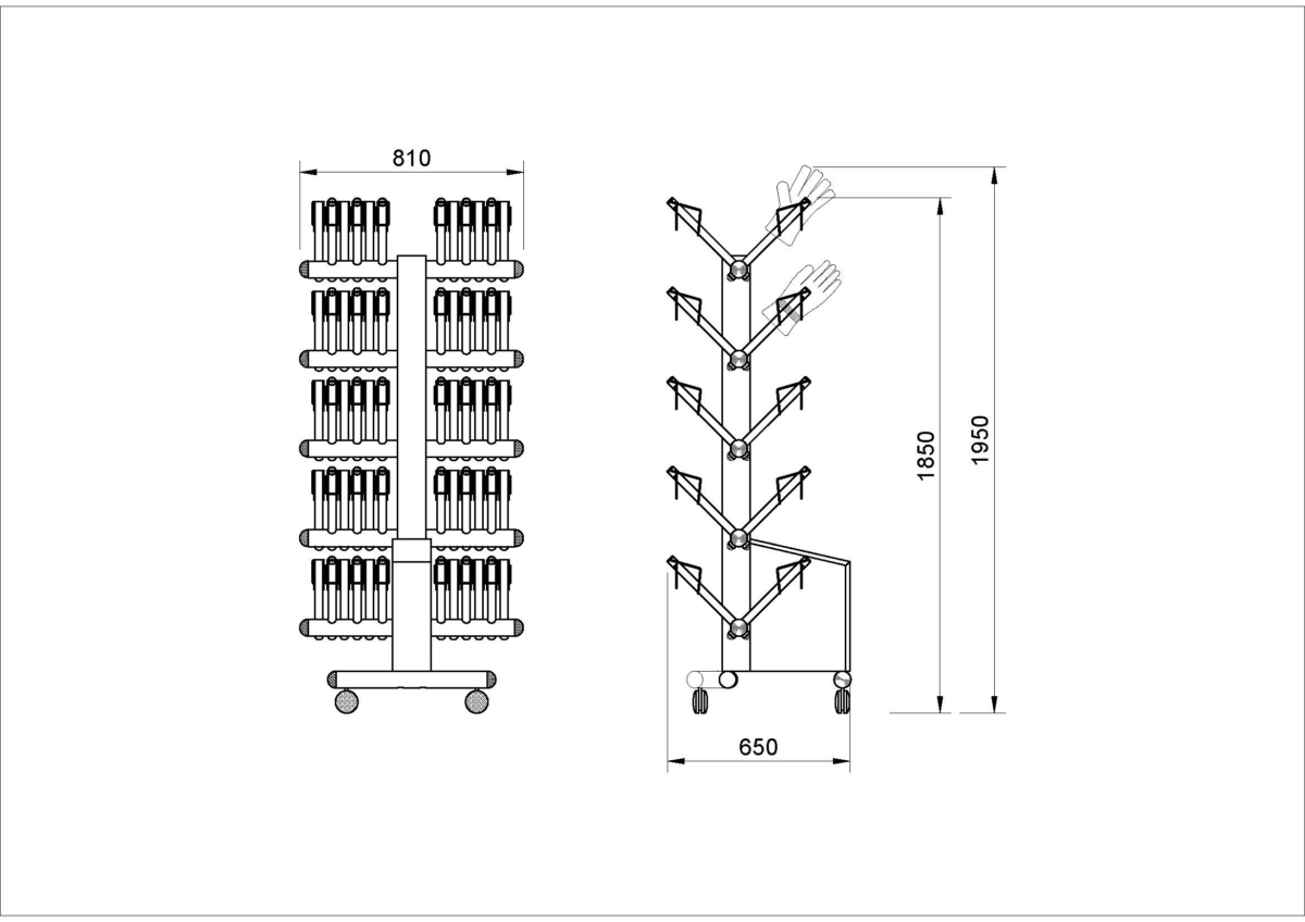 Secador de guantes HYGIgrip – 30 pares, doble cara, 100 % acero inoxidable 304L. Desinfecta sin químicos todo tipo de guantes. Equipado con manguitos específicos y 4 ruedas giratorias. Compacto, robusto y eficaz.