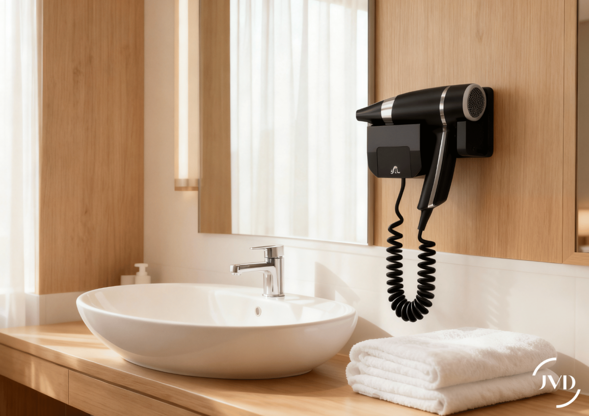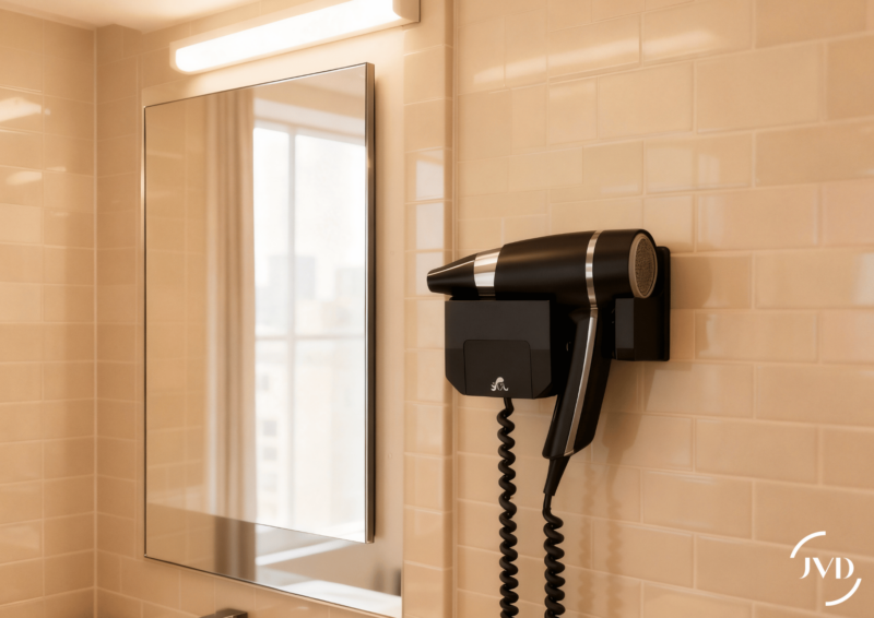 Sèche-Cheveux Brittony noir + support frontal base, 1600 W, mise en marche par simple prise en main grâce à sa poignée brevetée LighTouch. 6 configurations de séchage et équipé d'un système ionisant. Installation volume 3.